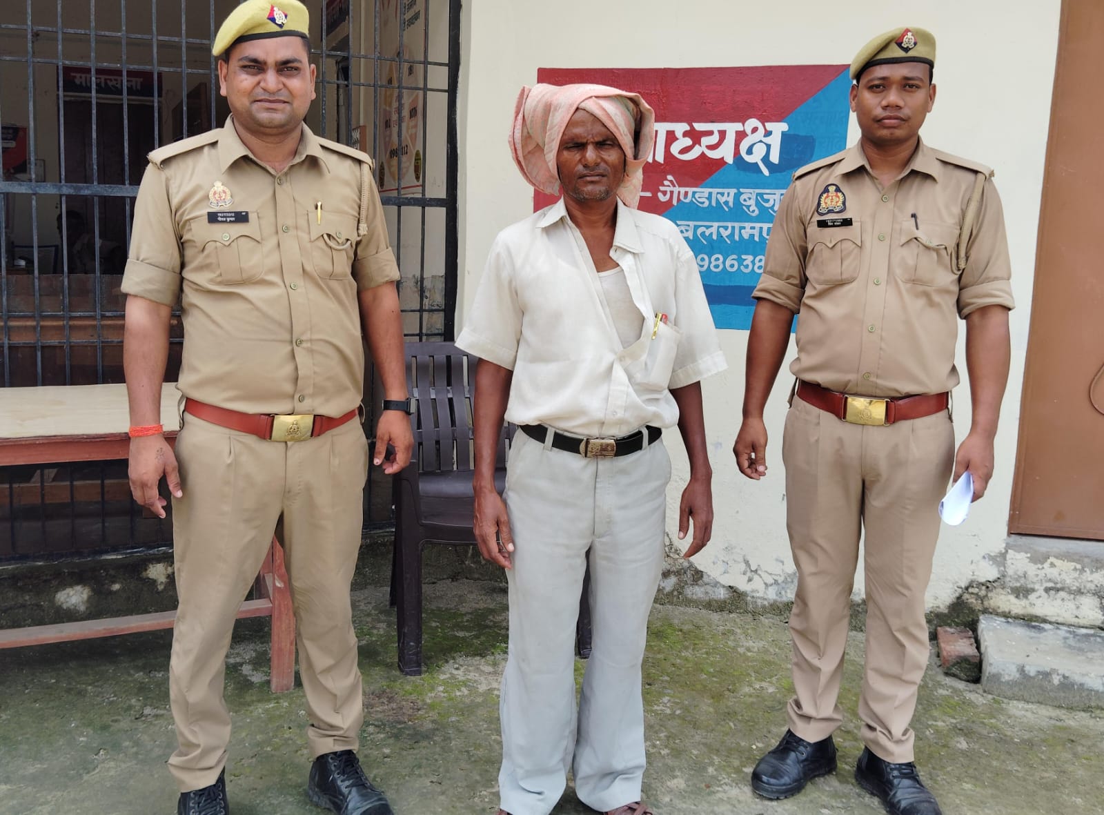 गैंडास बुर्जुग,बलरामपुर।पुलिस अधीक्षक बलरामपुर विकास कुमार द्वारा अपराध एवं अपराधियों पर अंकुश लगाए जाने हेतु चलाए जा रहे अभियान के क्रम में अपर पुलिस अधीक्षक श्रीमती नम्रिता श्रीवास्तव व क्षेत्राधिकारी उतरौला राघवेन्द्र सिंह के पर्यवेक्षण में तथा थानाध्यक्ष गैंड़ास बुजुर्ग दुर्विजय के नेतृत्व मे आज दिनांक 22.09.2024 को थाना गैंड़ास बुजुर्ग के उप निरीक्षक अनिल कुमार मय टीम के द्वारा देखभाल क्षेत्र एवं तलाश वांछित अपराधी व वारण्टी के दौरान माननीय न्यायालय CJJD/JM UTR बलरामपुर द्वारा सम्बन्धित मामला संख्या 835/99/95 धारा 498 भादवि0 से सम्बन्धित वारण्टी मनीराम उर्फ धनीराम पुत्र रामसुख कोरी निवासी ग्राम मलमलिया थाना गैण्डास बुजुर्ग जनपद बलरामपुर के विरूद्ध जारी NBW के अनुपालन में अभियुक्त मनीराम उर्फ धनीराम उपरोक्त को गिरफ्तार कर नियमानुसार न्यायालय रवाना किया गया।